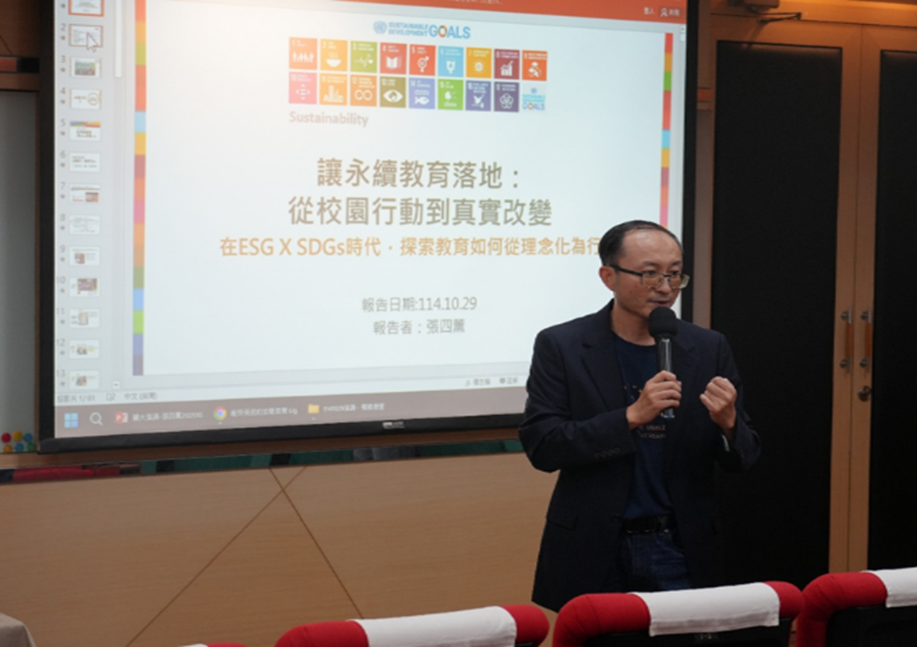 本次SDGs系列講座以永續教育實踐為主題,成功吸引師生參與交流,透過專題演講與案例分享,深化與會者對ESG與SDGs融入教育現場的理解。講座內容結合理論與校園實務經驗,協助參與者掌握將永續理念轉化為具體行動的方法,並促進跨領域對話與合作契機。
